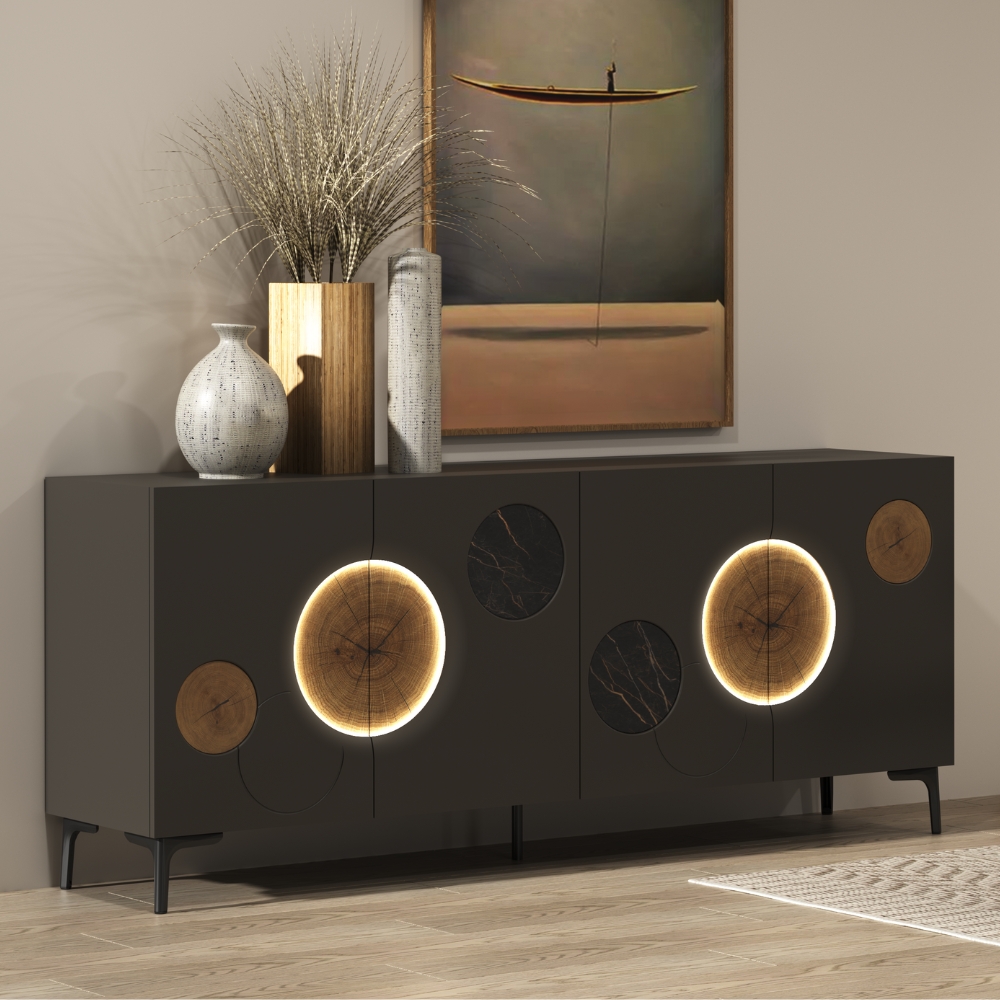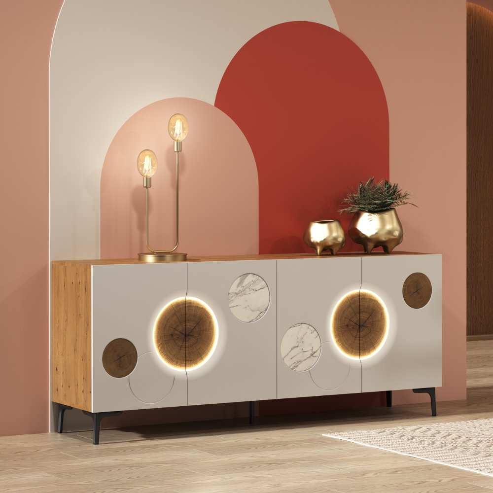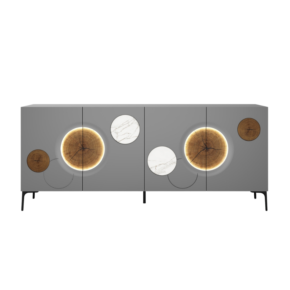 Fonctionnel et expressif à la fois, ce modèle affirme une présence minérale tout en subtilité. Sa façade, animée d’un jeu de bulles graphiques, associe la chaleur brute du bois à la pureté éclatante de la céramique, évoquant des galets doucement polis par les vagues. Posé sur ses pieds fins en métal, ce buffet 4 portes offre un espace de rangement généreux derrière une silhouette légère, apportant à votre pièce de vie un véritable souffle de sérénité. L’éclairage LED optionnel transforme la façade en un jeu de lumière délicat, faisant vibrer la texture du bois et révélant toute la poésie du meuble.