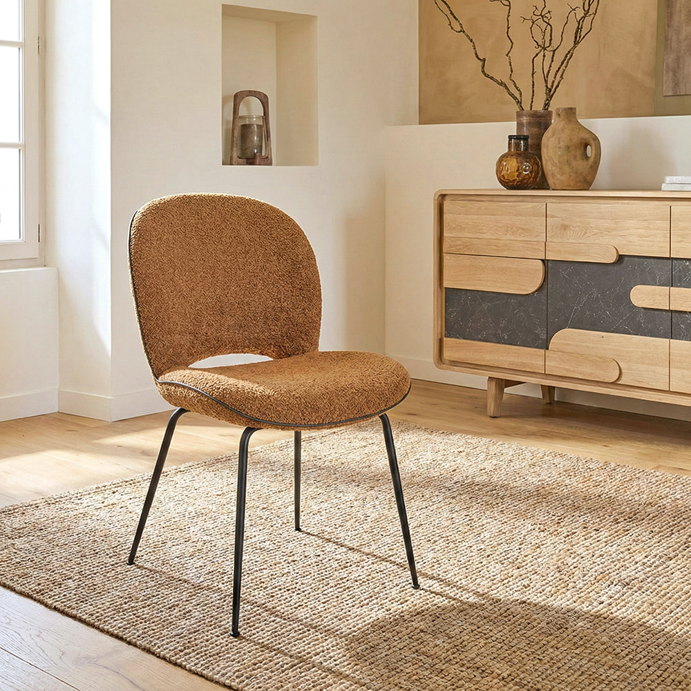 Sa mousse assure un maintien optimal, tandis que son tissu bouclé apporte chaleur et modernité. Le piétement fin en métal noir crée quant à lui un contraste raffiné avec l’assise. Déclinée en 4 coloris tendance, elle crée un décor où l’on a envie de s’attarder, que ce soit dans la salle à manger, un espace de travail ou près d’une bibliothèque. Mixez les teintes, jouez les contrastes, associez-la au bois clair, au cannage ou à un tapis en jute : la chaise RING accompagne vos instants de vie avec style et simplicité.