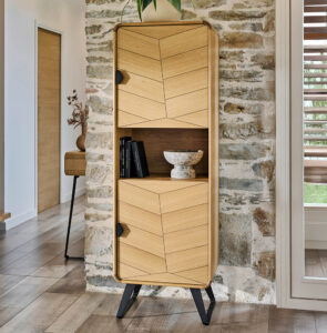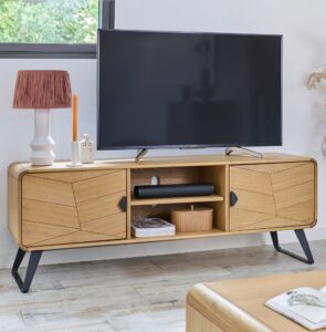 Sa niche centrale modulable accueille vos consoles et box, tandis que les portes au motif chevron masquent Hifi et accessoires pour un rendu épuré. Son plateau offre un support élégant pour votre écran tout en laissant respirer la pièce, et son piétement trapèze en métal noir mat apporte une touche contemporaine et graphique. Entre le veinage chaleureux du chêne clair et les lignes nettes de sa structure, ce meuble impose une signature forte dans votre salon.