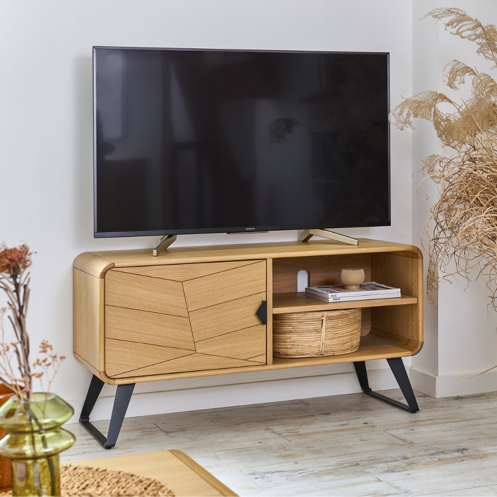 Sa niche centrale modulable accueille vos consoles et box, tandis que les portes au motif chevron masquent Hifi et accessoires pour un rendu épuré. Son plateau offre un support élégant pour votre écran tout en laissant respirer la pièce, et son piétement trapèze en métal noir mat apporte une touche contemporaine et graphique. Entre le veinage chaleureux du chêne clair et les lignes nettes de sa structure, ce meuble impose une signature forte dans votre salon.